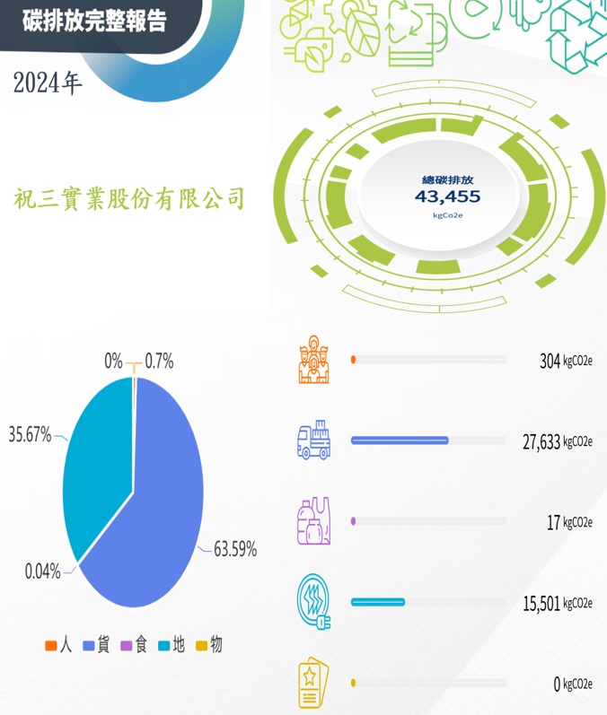 本公司依整體所有[人、貨、食、地、物]各項目總碳排放統計比例,年度總碳排放為43,455 kgCO2,在於交通接送業務統計佔2024年整體為63.59%,總排放為27,633 kgCO2。年度能耗分別如下: