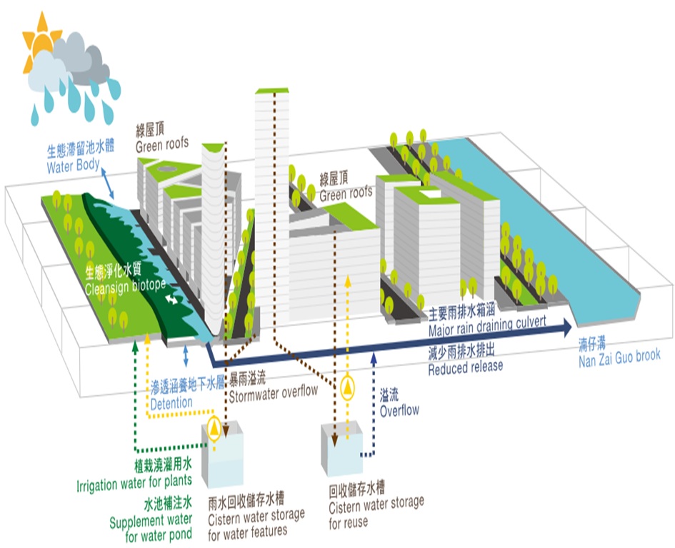 (3).生態滯洪池:於1.2萬坪(4萬平方公尺)的中央公園內設置生態滯洪池,主要功能為收集雨水,儲存,處理和再利用,以及中央水道,濕地,生態池,水生植物的景觀呈現,成為人們休憩場所,同時也是候鳥等生物之飲用水,並具城市環境熱交換與氣候蒸發用水。